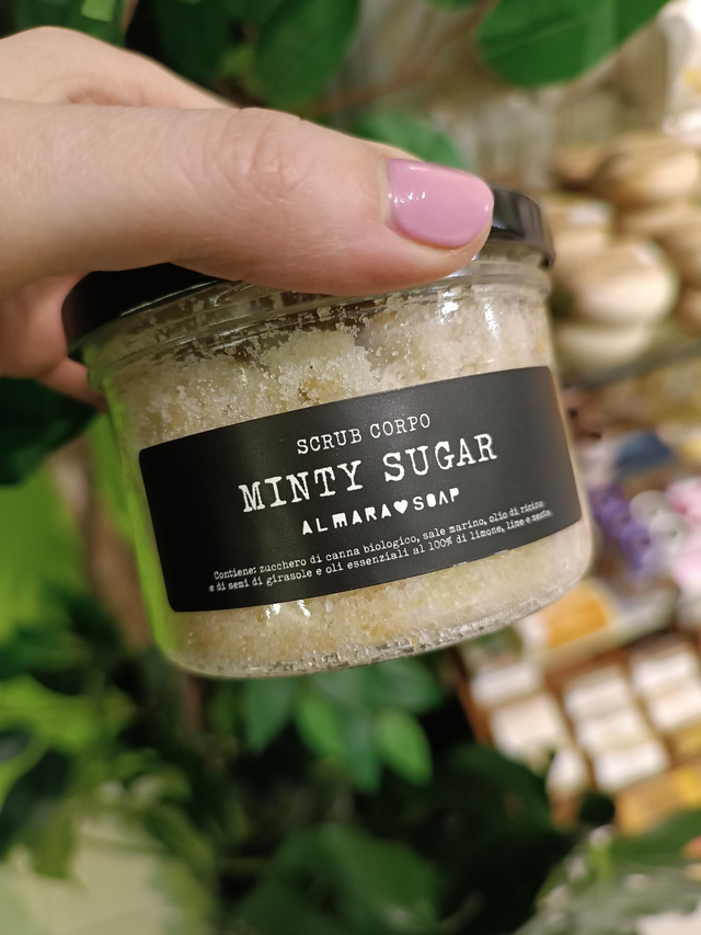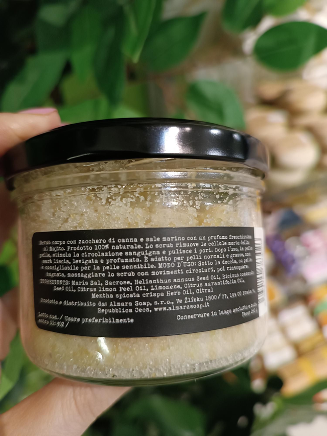 Scrub corpo in polvere di Almarasoap. Conzucchero di canna bio, sale marino, olio di ricino, olio di semi di girasole e oli essenziali al 100%di limone, lime e menta. Prodotto 100% Naturale. Adatto per pelli normali e grassi, non consigliato per pelli sensibili. 180g.